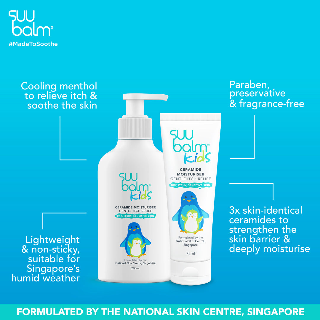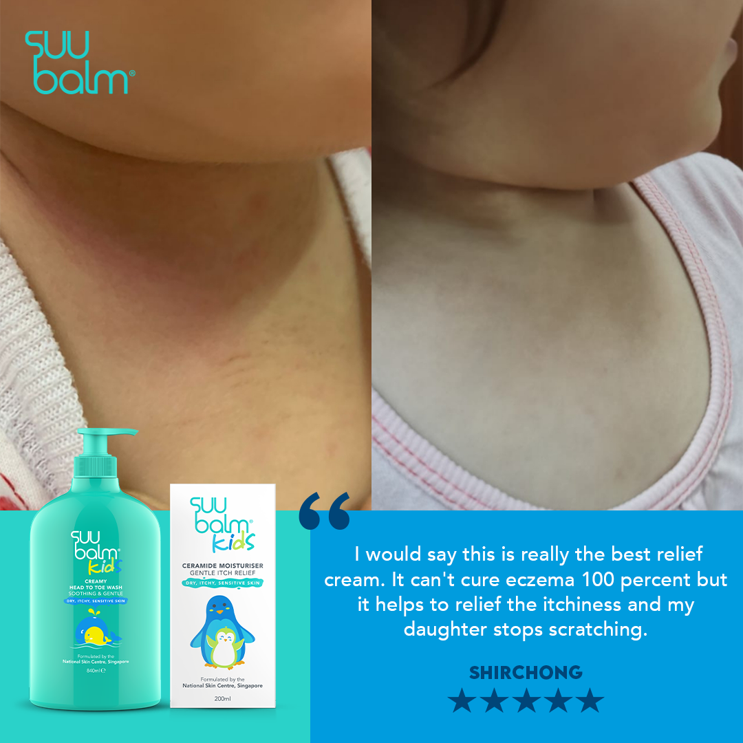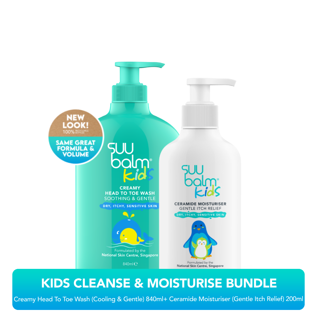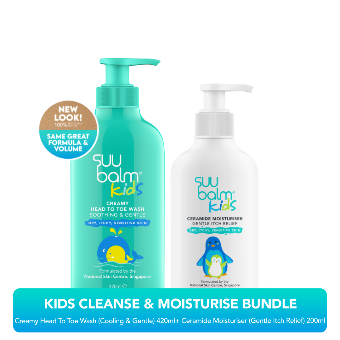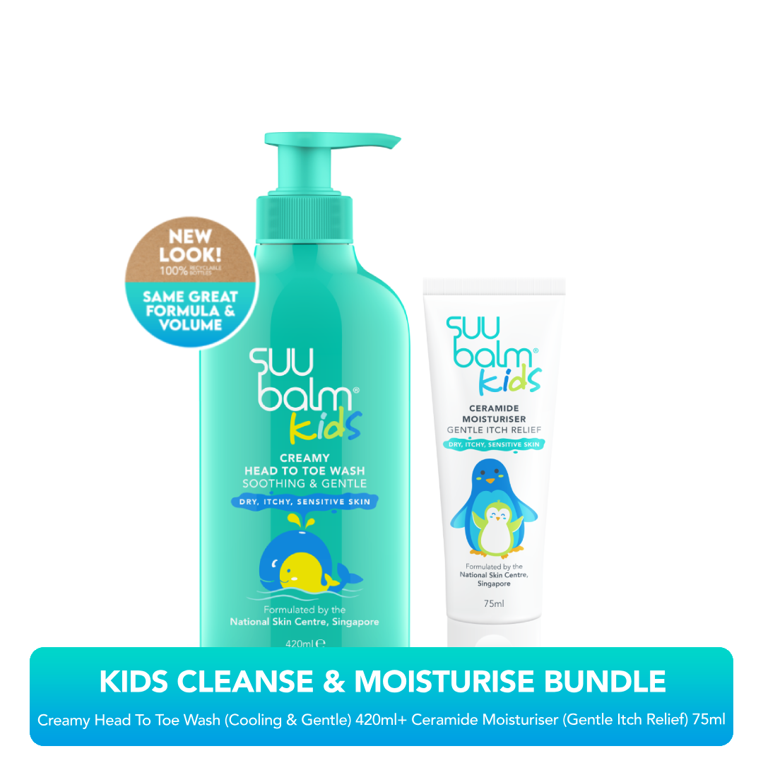 This bundle provide every parent with an easy start to manage and care for your little one’s tender eczema prone skin. This 2-step routine consists of the Suu Balm Kids Creamy Head To Toe Wash (Soothing & Gentle) along with our fast itch-relieving moisturiser- the Suu Balm Kids Ceramide Moisturiser (Gentle Itch Relief).