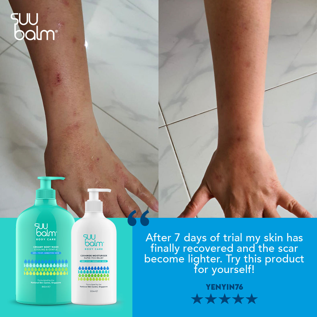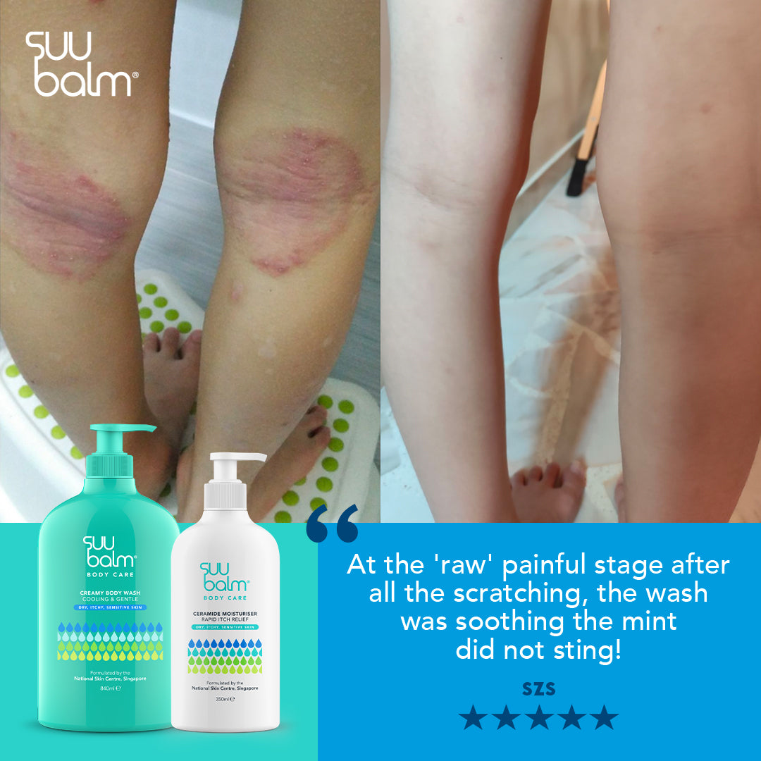 Use when showering or bathing, daily or more often if needed. Apply to the body to gently cleanse, and then rinse off. Do not use if you are allergic to any of the ingredients. For best results, keep your showers short and do not use water that’s too hot. After showering, pat your skin dry and apply your Suu Balm Ceramide Moisturiser (Rapid Itch Relief) to body regions with itch or dryness.