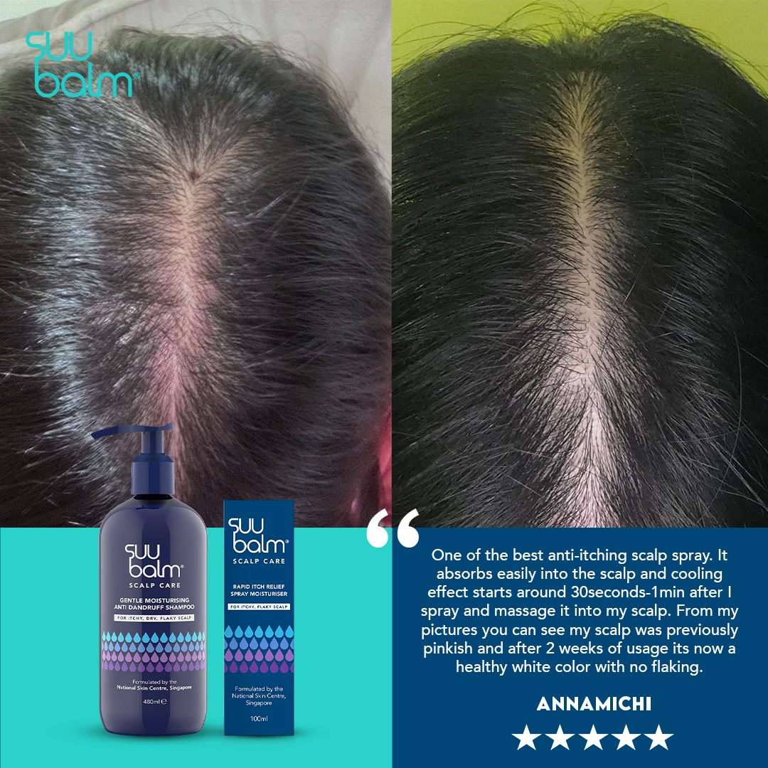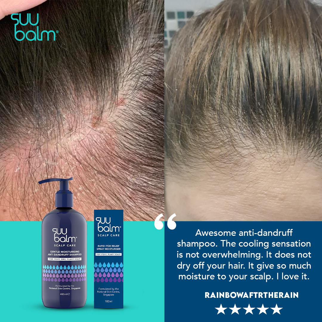 Suu Balm Gentle Moisturising Anti Dandruff Shampoo is formulated for itchy, flaky, sensitive scalp. 3 anti-dandruff actives reduce scalp flaking in 7 days*, and menthol provides cooling itch relief in minutes. This shampoo is sulfate, paraben, silicone and fragrance-free and hypoallergenic.