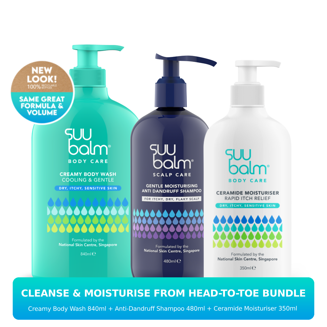 该套装让每位用户都能轻松开始管理和护理易患湿疹的娇嫩皮肤和头皮。该套装分为 3 个步骤,使用清凉温和沐浴露和温和保湿去屑洗发露,从头到脚缓解瘙痒。沐浴后使用神经酰胺润肤霜(清凉止痒)作为补充!